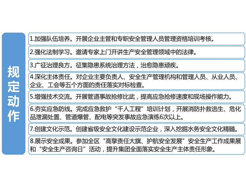 本屆安全生產文化月以宣傳貫徹中共中央國務院《關于推進安全生產領域改革發展的意見》為主線,以“全面落實企業安全生產主體責任”為主題,以創建省級安全文化建設示范企業為契機,立足集團公司“四全、四化”安全體系建設中心,通過開展八項“規定動作”和七項“特色活動”,強化安全“紅線”意識,弘揚水務安全文化,為促進集團可持續安全健康發展提供有力的思想保證、文化條件和輿論支持。