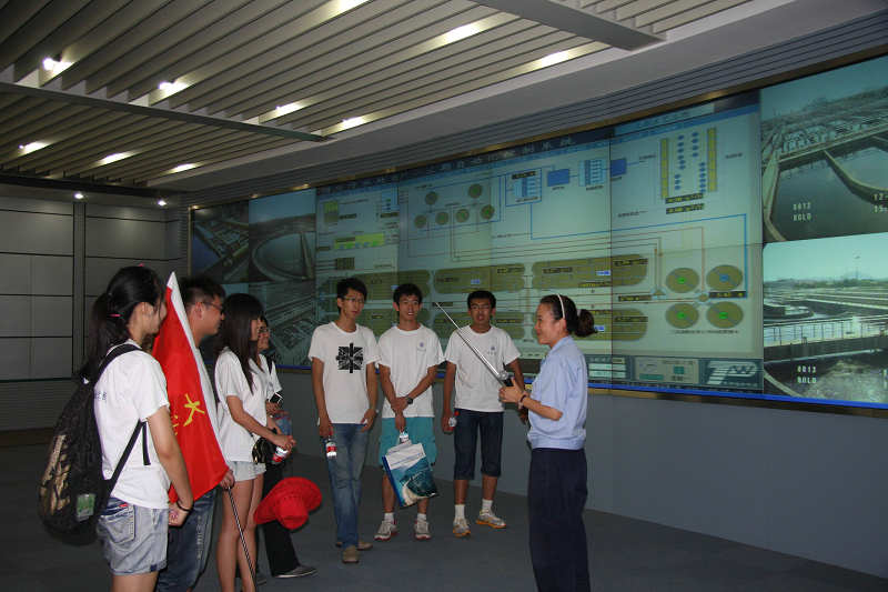圖為大學生在中控室聽取污水處理情況介紹