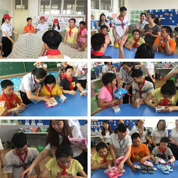 在學校老師的帶領下,“愛心媽媽”和黨員志愿者們陪伴特殊孩子們一起參與躲鯊魚、網(wǎng)布傳球和擊鼓傳花等互動游戲,并為孩子們送去了住校用的拖鞋、毛巾等物資,用愛心給孩子們帶去歡笑,給予他們溫暖與關懷。